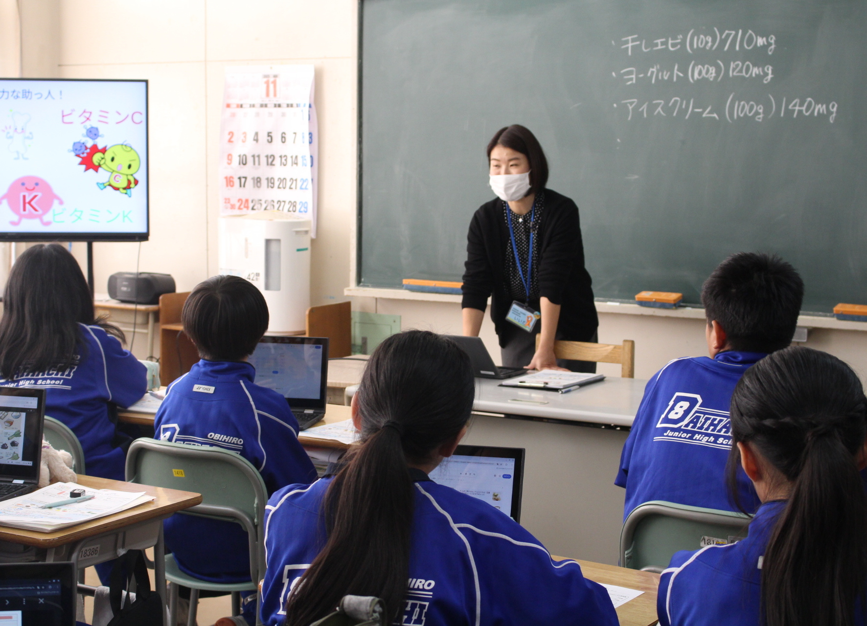11月19日(水)は、1年生を対象に、帯広市教育委員会から講師の先生をお迎えして、食育出前授業が行われました。今回は、特にカルシウムの含まれる食品について知識を深めました。