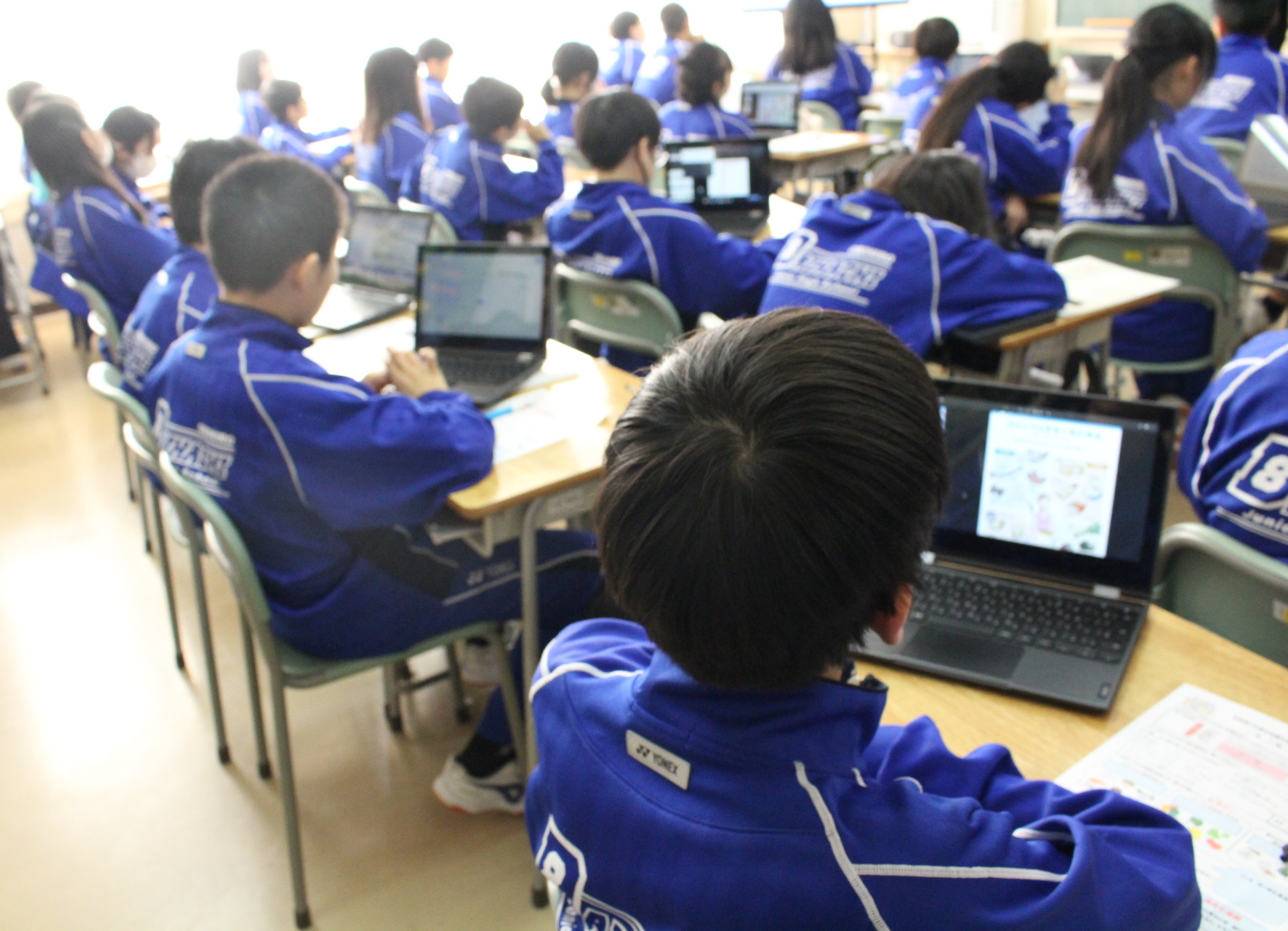 カルシウムを骨に蓄えておくことができるのは、成長期だけ。成人男性では1日1000mg、女性は1日800mgを目安に摂取することが大切だと学び、子どもたちはクロームブックを使って、身近な食品に含まれるカルシウム量を調べました。