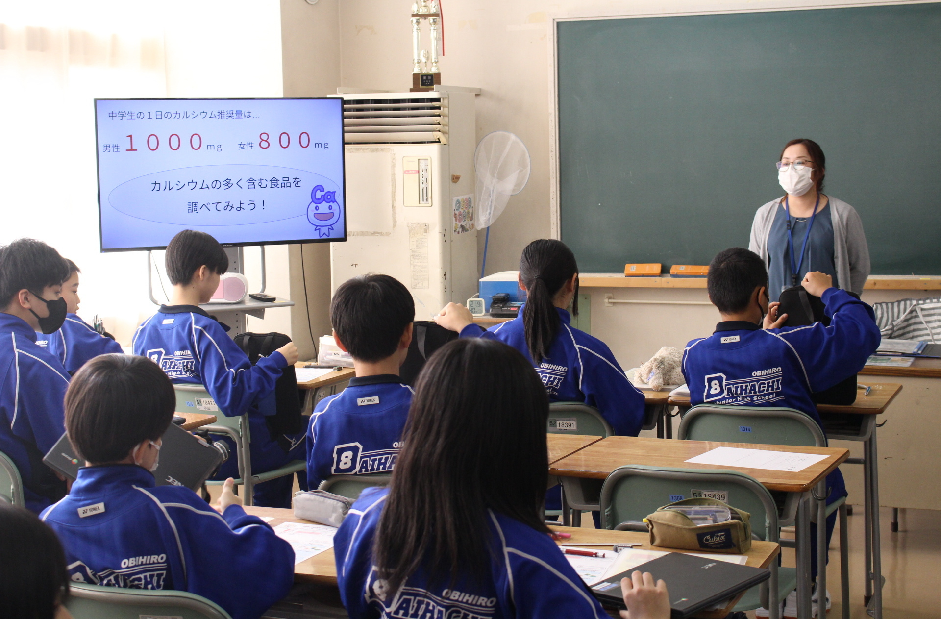 11月19日(水)は、1年生を対象に、帯広市教育委員会から講師の先生をお迎えして、食育出前授業が行われました。今回は、特にカルシウムの含まれる食品について知識を深めました。