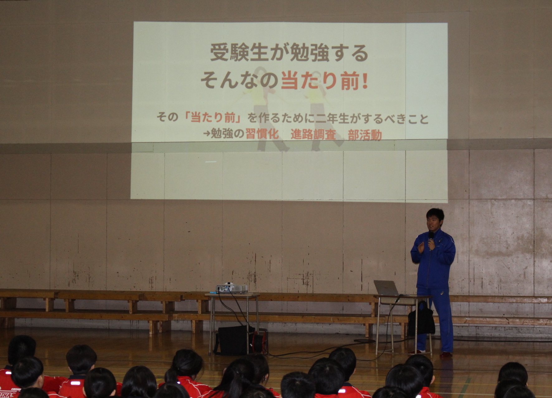 第八中学校の卒業生が、高校生インターンシップとして4名の先輩が来校しました。高校生からは、1年生と2年生に向けて「中学校生活で大切にしてほしいこと」としてメッセージをいただきました。