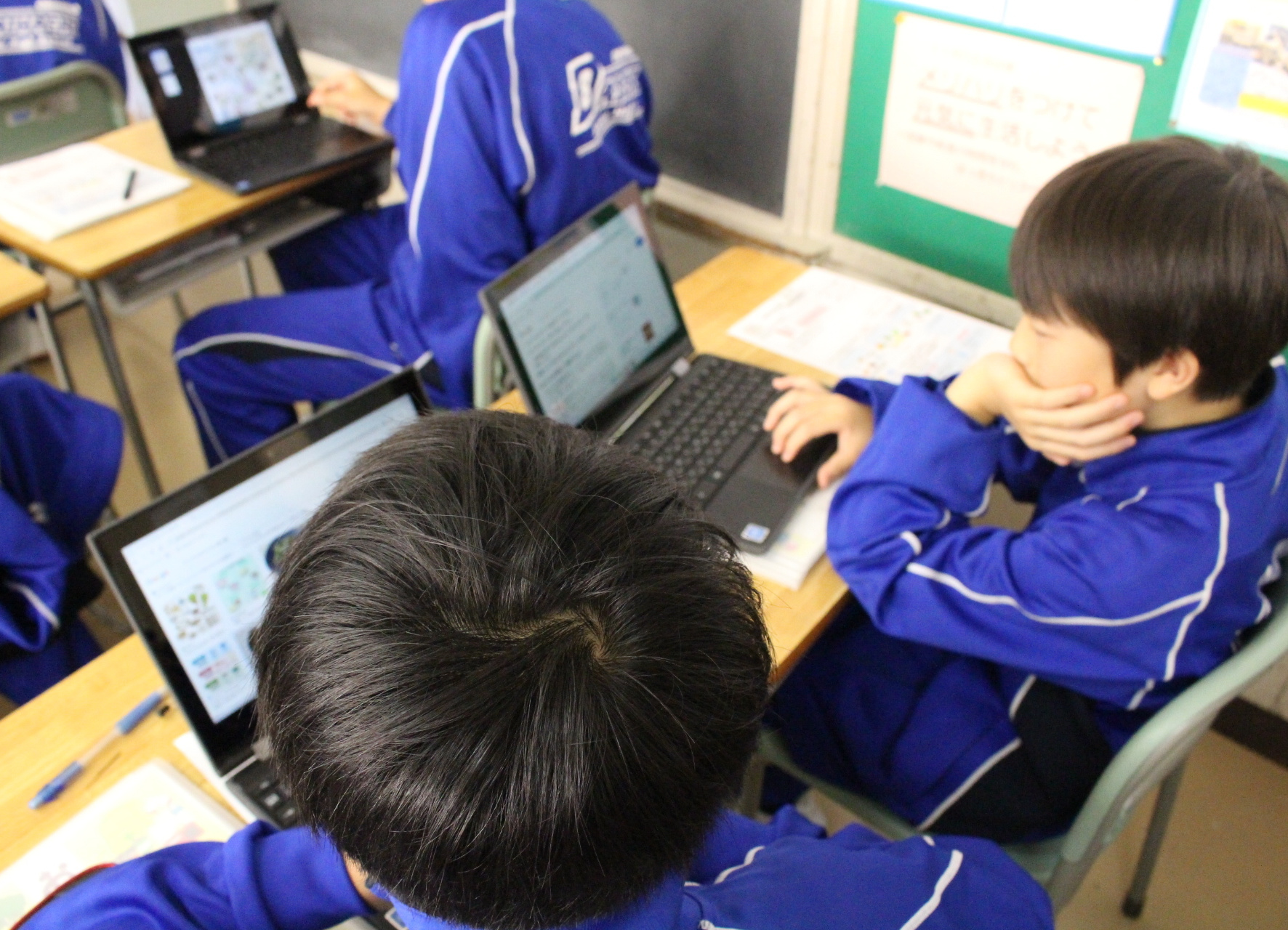 カルシウムを骨に蓄えておくことができるのは、成長期だけ。成人男性では1日1000mg、女性は1日800mgを目安に摂取することが大切だと学び、子どもたちはクロームブックを使って、身近な食品に含まれるカルシウム量を調べました。